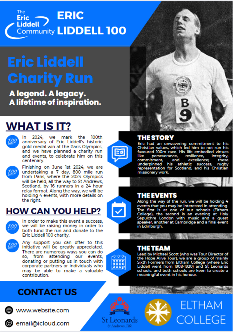 The 24 Tour starts in Paris and will finish on the beaches of St Andrews, where the famous running sequence from the Academy-winning movie Chariots of Fire – based on Eric Liddell’s life – was filmed. It’s being run by students from two schools in England and Scotland: Eltham College, where Eric went to school, and St Leonards School in St Andrews, where the route finishes.